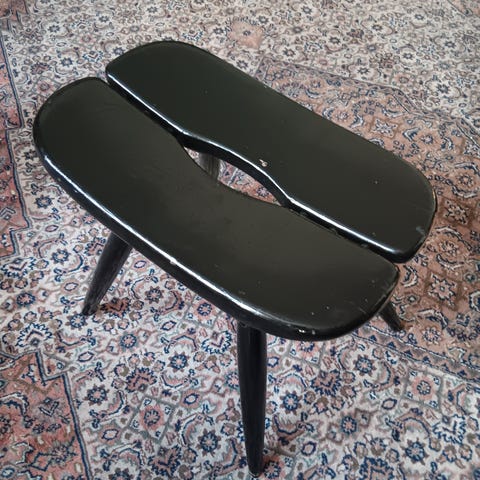 Projektiksi Artek / Ilmari Tapiovaaran suunnittelema Pirkka jakkara. Tästä on aikoinaan jalat vaihdettu metallirunkoon ja alkuperäiset jalat eivät ole tallella.
