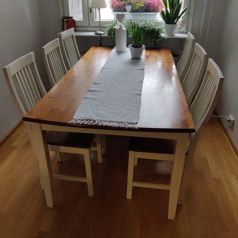 Vanha ruokailuryhmä . Pituus 180 cm, jatkopala 55 cm . Neljä tuolia. Pöydän pinnassa on jälkiä. Saa todennäköisesti ns vahalla jälleen kiiltäväksi .