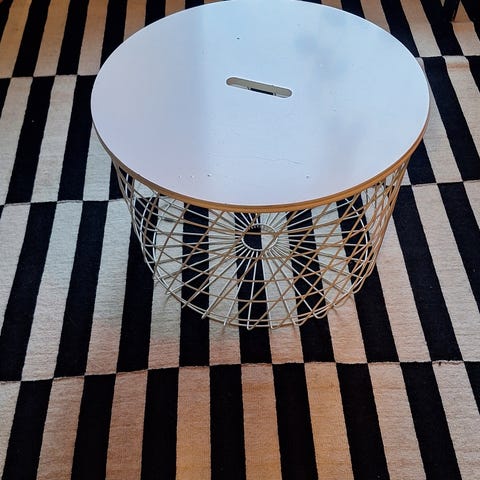 IKEA KVISTBRO säilytyspöytä mustaa metallia. Pyöreä muoto, jossa metallinen ritilärunko ja irrotettava kansi, joka toimii myös pöytätasona. Kuin uusi