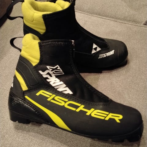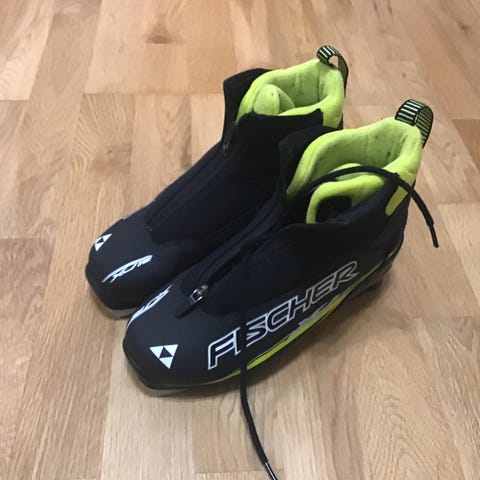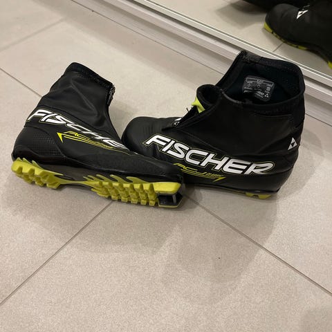 Fischer hiihtokenkä musta keltainen. Kenkässä on vetoketjullinen suojus ja sisällä nauhat