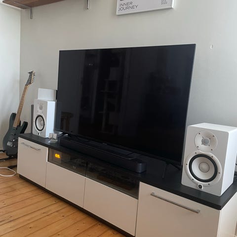 Valkoinen TV-taso. Kolme erillistä osaa. Voidaan pinota myös päällekkäin hyllyksi. Paljon käytönjälkeä ja kulumaa siellä täällä.