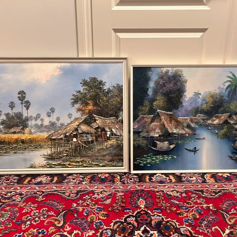Vuonna 1970 Vanhempani Kävi Thaimaassa ja ostivat teoksen Thaimaalaista kauppa arkea galleriasta.En tiedä miten tehdyt kun läheltä katsoo ei näy kuin värejä läjässä,mutta kun seinälle laitaa ja katsoo kauempaa,tulee ihmiset ja kauppaveneet selvästi näkyviin.Samoin koukut yms.Signeerattu mutta en saan tai ymmärrä Thaimaan kieltä,ymmärrätkö sinä? Teoksen korkeus on 52cm kehyksin teos(43cm) Leveys kehyksin 67cm (kuva 59cm)Todellakin Aito Vintage taulu ja on hieno.Nyt Uuteen kotiin vain 39e!