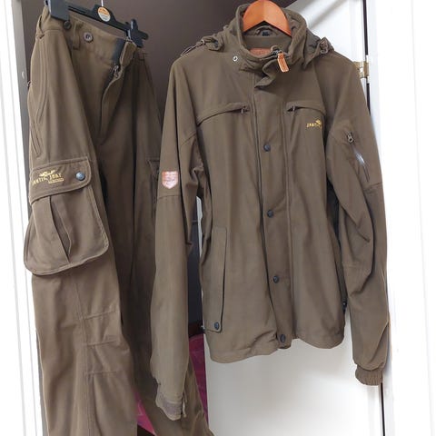 Metsästysasu valkoisella maastokuvioinnilla, koko XL. Takki ja housut valmistettu materiaalista, joka soveltuu metsästykseen ja ulkoiluun. Väri ja kuviointi auttavat sulautumaan luonnonympäristöön.