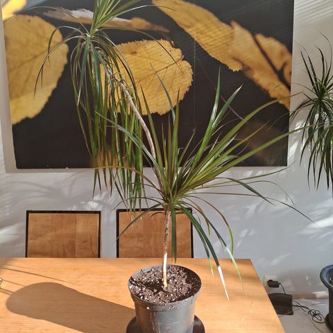huonekasvi traakkipuu, jossa kapeat pitkät lehdet ja ohut runko. multa vaihdettu, kaunis ruukku tulee mukaan