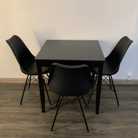Myynnissä hyvässä kunnossa kuvan mukainen ruokapöytä sekä 3 tuolia, pöydän jalat purettu kuljetusta varten ja kaikki ruuvit tallessa. Helppo kantaa