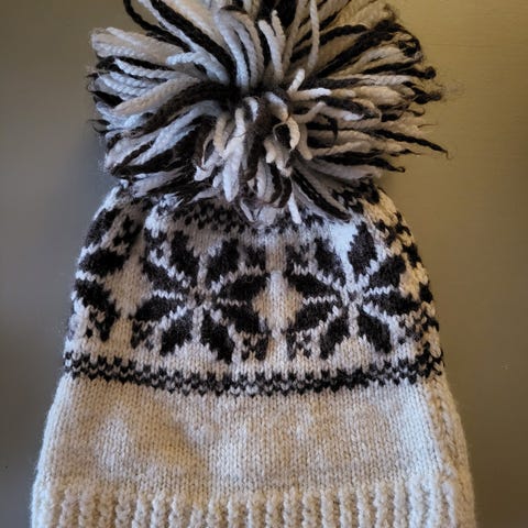 Pari kertaa käytössä ollut paksu harmaa tupsupipo. Koko S-M.