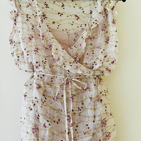 Käytetty, siistissä kunnossa, muuta langanpako. Aivan ihana röyhelöhelma. Vyötärön saa kiinni napeilla ja säädettävällä kiristysnauhoilla