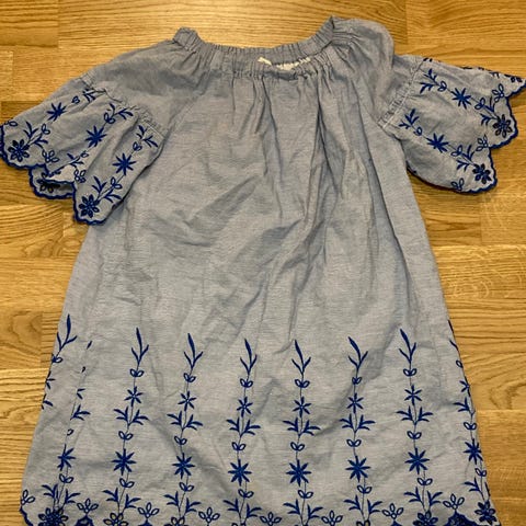 Zara: Valkoinen mekko kokoa 128 cm (8 y.). Hyväkuntoinen. Takana helman sivuosassa pienet kuvanmukaiset haaleat tahrat kuosin seassa, jotka eivät erotu käytössä.