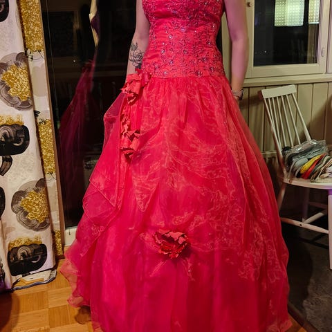 Myydään pinkki juhlamekko. Korsettiosassa kirkkaita ja mustia muovitimantteja ja paljetteja. Käytetty kerran vanhojen tansseissa. Siistissä kunnossa, ehjä ja tahraton. Sopii noin XS/34-S/36 -kokoiselle. Selässä nyöritys, jolla kokoa saa muokattua. Kuvissa päällä 165cm henkilöllä matalilla korkokengillä. Henkilön vaatekoko noin XS/34.