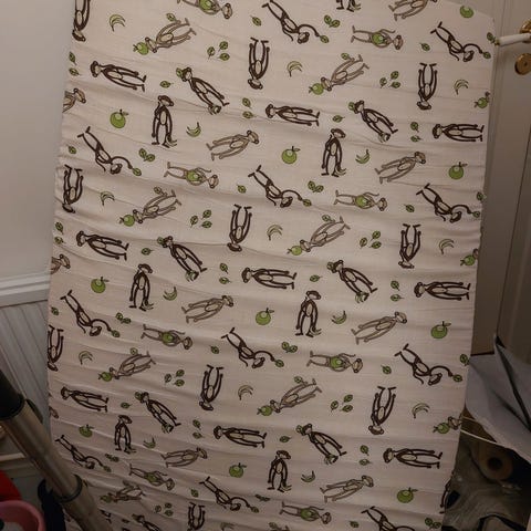 Uudenveroinen lasten patja kauniilla apina-päällyksellä. Irrotettava ja konespestävä päällys, avautuu vetoketjulla kätevästi. Merkki: Finlayson Familon. Made in Finland.