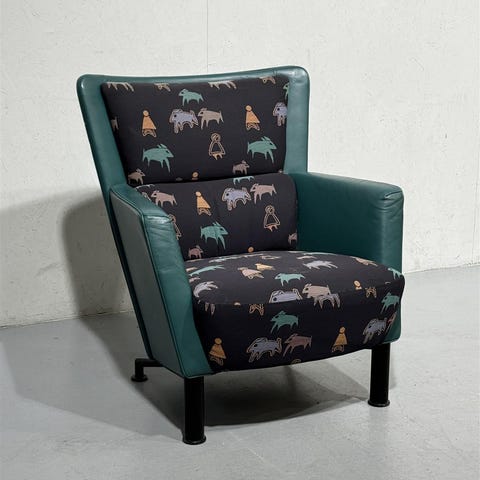 Kinnarpsin valmistama tukeva nojatuoli 2 kpl, jossa on värikäs kuvioitu kangas ja vihreät nahkaosat. Tuolissa on mustat tukevat metallijalat ja se on suunniteltu mukavuutta silmällä pitäen. Tuoli edustaa modernia retrotyyliä, jossa yhdistyvät perinteiset ja nykyaikaiset elementit. Kuviointi tuo esiin leikkisän ja ainutlaatuisen ilmeen. Tuolissa on havaittavissa pientä kulumaa käsinojissa, mutta ne on muuten hyvässä kunnossa.