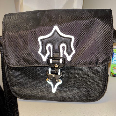 Uusi laukku, hihna, heijastin. Tilava laukku, kaksi pikkutaskua päädyissä, sivussa pidempi neljäs tasku.