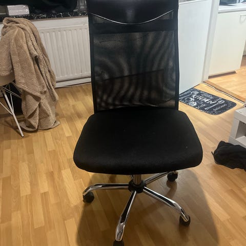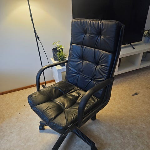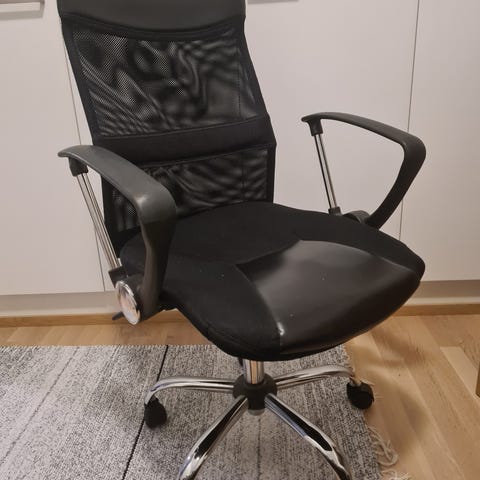 Mustan värinen toimistotuoli, jossa keinonahkainen verhoilu. Tuolissa on kääntyvät ja säädettävät ominaisuudet sekä pyörät jalustassa liikkumista varten. Sopii työpistekäyttöön.
