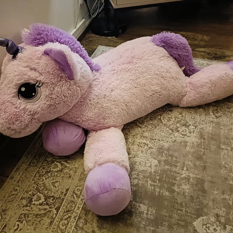 Iso yksisarvinen pehmolelu, pääosin valkoinen, jossa vaaleanpunaiset ja sateenkaaren värit yksityiskohdissa. Pehmeä materiaali, soveltuu lasten leikkeihin ja sisustukseen. Hieman likainen. Koko noin metrin.
