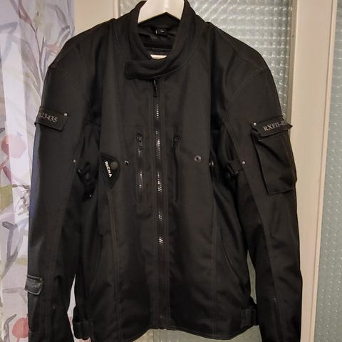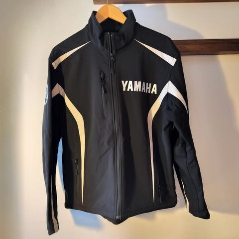 Musta vetoketjutakki, Yahama. Pystyt vetoketjutaskut edessä ja yksi vetoketjullinen povitasku. Paljon painatuksia. Kunto hyvä++ Koko M.