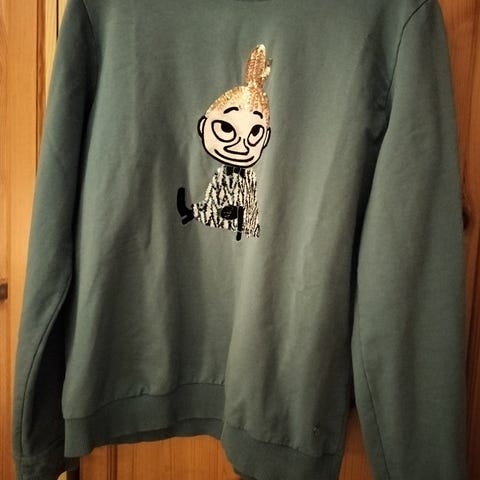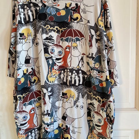 Uutta vastaavassa kunnossa, musta collari by Martinex. Paljettikoristelu edessä, jossa Nuuskamuikkunen istuu kukan sisällä. Kukan varsi jatkuu helmaan asti, mustana paljettina. Pussihihat, A-linjainen malli, reilu mitoitus ja pituus. Nouto on myös mahdollista.