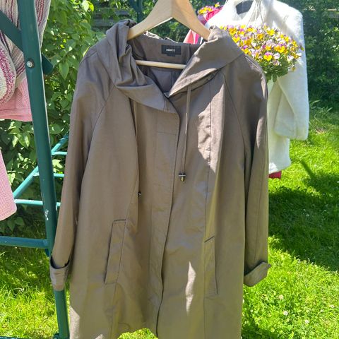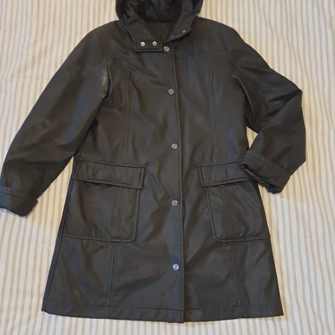 Junge pitkä naisten takki mustassa värissä, Ka/ka 54 cm ja pituus 87 cm. Takissa on iso huppu. Kankaan pinta hieman kiiltävää, joten pitää sadettakin hieman. Ohut vuori ja 3 taskua, yksi sisällä sivussa. Koko L/XL.