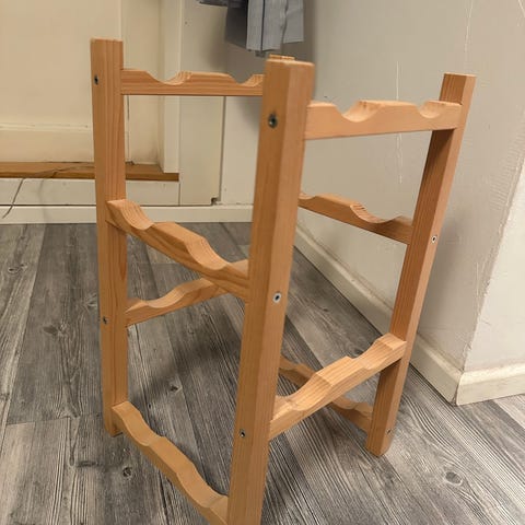 Puinen tumma viinipulloteline. Mahtuu 7 pulloa.