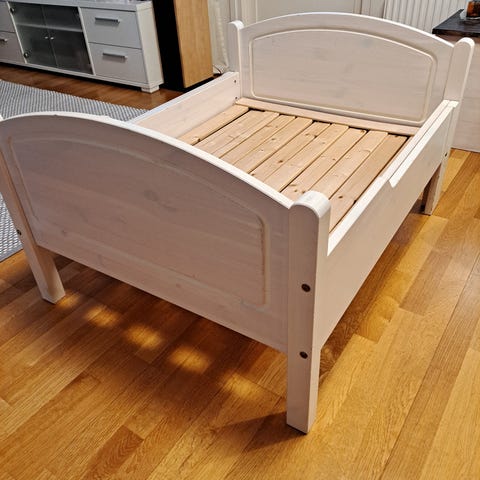 Myydään lasten jatkettava sänky 75x100-180cm. Käytön jälkiä (kts. kuva). Myydään koottuna tai osissa ostajan toiveen mukaan. Patja ja sänkyverho eivät kuulu kauppaan.