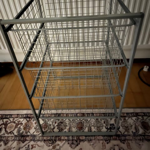 Myydään kolme syvää laatikkoa sisältävä valkoinen Elfa-korihyllykkö/säilytysjärjestelmä.