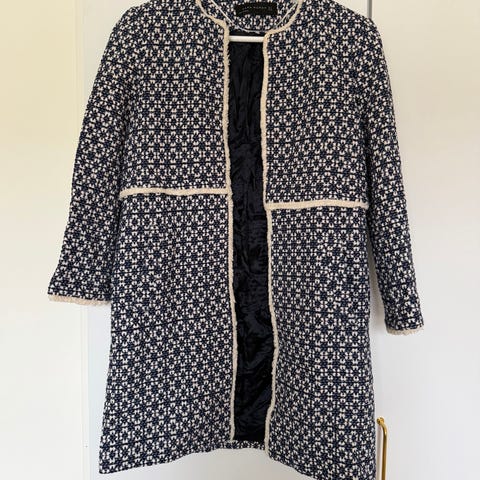 Zara Basic sininen pitkä takki, koko S. Valmistettu polyesteristä. Naisten mallinen takki, jossa on pitkä malli ja klassinen leikkaus. Selän vuoresta tikkaus hiukan "irvistää". Ks. Viimeinen kuva. Muuten kunto on kuin uusi.