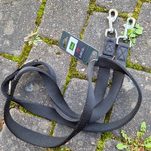 Taluttajan vyötärölle kiinnitettävä joustava talutushihna, noin 160cm hihnalla.