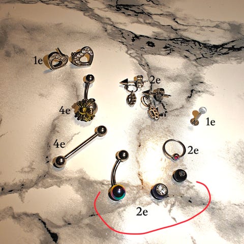 Setti nännikoruja; 3 tanko ja 8 palloa. Tangoissa kiinteinä aina yksi pallo. Kaksi mustaa palloa käyttämättömiä, muut olleet vähäisellä käytöllä. Kaikki puhdistetaan ja desinfioidaan ennen myyntiä. Materiaali kirurginterästä tai titaania (ei allergisoi). Kaikki ostettu lävistysliikkeestä Suomesta.