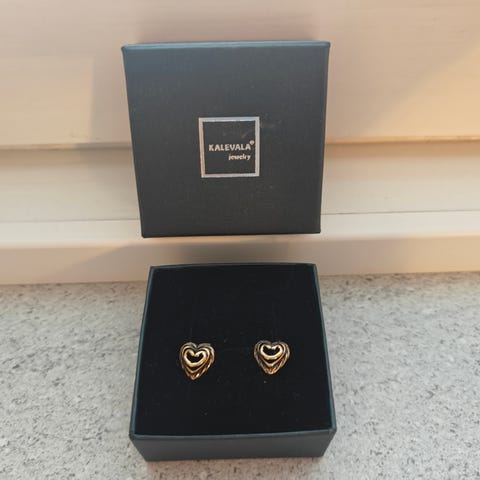 Kalevalan pronssinen Talon Sydän sarjan setti, jossa korvakorut ja riipus. Mukaan saa ketjun 23cm, joka käy riipuksen kanssa esim rannekoruksi.
