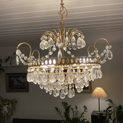 Upea isokokoinen kristallikruunu. Korkeus 110cm halkaisija 65cm. Ketjun kanssa 220cm.