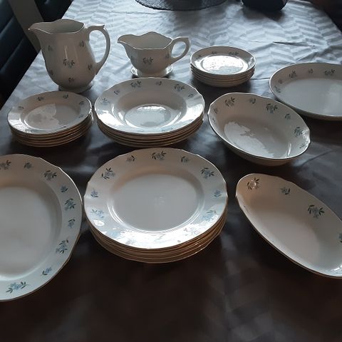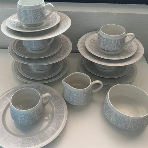 Arabia moniosainen astiasto, joka sisältää lautasia, kulhoja ja tarjoiluastioita. Astiastossa on valkoinen väri ja koristeellinen kuviointi. Sopii ruokailuun ja tarjoiluun kotitalouksissa. Osassa lautasia pieniä kolhuja. Näkyy kuvissa. Myydään tarjousten perusteella, lähtöhinta 150 eur. En voi lähettää.