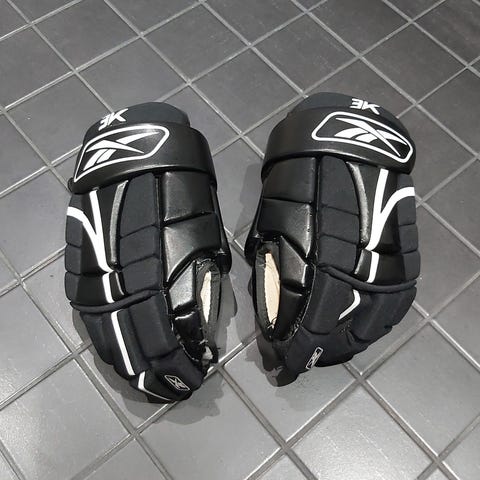 Reebok 24K jääkiekkohanskat, koko 28 cm. Oikean käden hanska hyväkuntoinen, vasemmassa kulumaa.