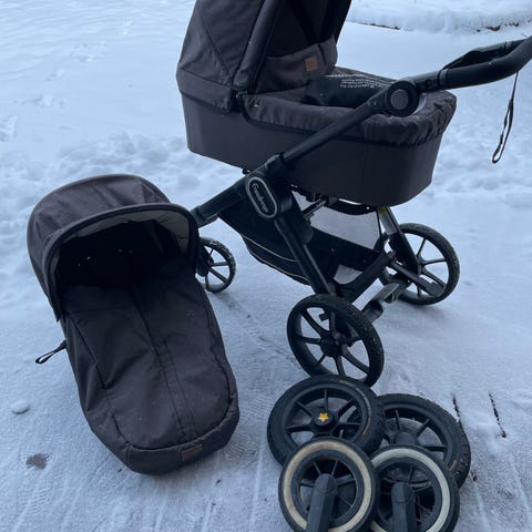 Emmaljungan hyväkuntoiset rattaat, joissa on irrotettava istuinosa ja kantokoppa.