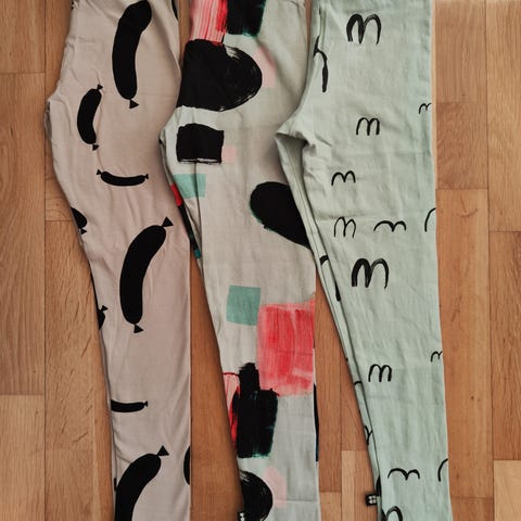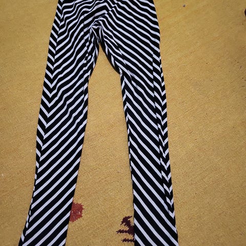 Neulos housut, koko 122/128cm. Valkoisissa raidoissa voi osin olla tummia kohtia, näkyy kuvassa, muutoin ehjät ja siistit.