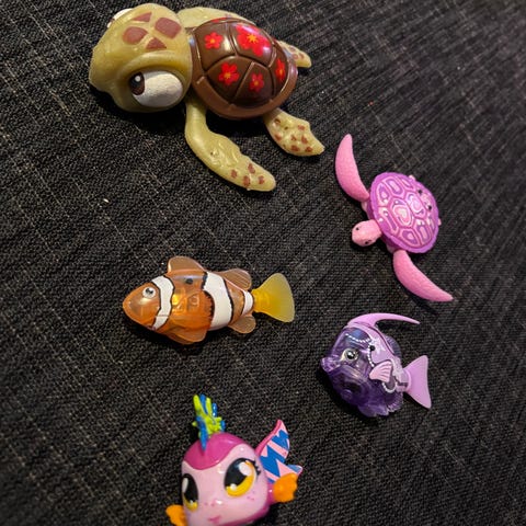 Muoviset kalat leluja eri väreissä ja kooissa. Setissä on erilaisia kaloja, jotka sopivat leikkeihin ja koristekäyttöön.