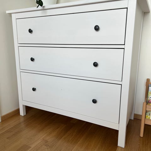 Hemnes lipasto, jossa kuusi laatikkoa. Väriltään valkoiseksi petsattu.