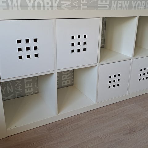 Lokerohyllykkö 4-lokeroinen, koko 60x60cm, väri pähkinä. Voi nostaa seinällä tai pitää lattialla. Painava. Vanhempaa Askon tuotantoa.