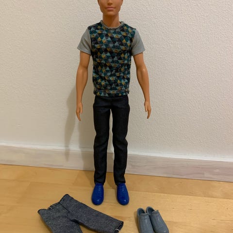 Ken-nukke sinisessä puvussa ja mustissa juhlakengissä. Nuken hiuksissa ja kulmakarvassa on kulumaa.