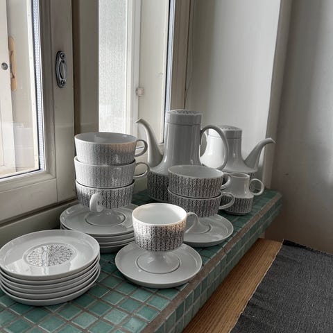 Virheetön ja hyvin pidetty Rosenthal Classic Germany/Pearl China-astiasto sisältää 9 kpl valkoisia posliinisia kahvikuppeja, kupin alusia ja pullalautasia, joissa on käsinmaalatut koristeet. Sarja soveltuu kahvi- ja ruokailukäyttöön.