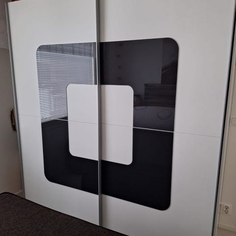 Hyväkuntoinen vaatekaappi jossa liukuovet, viisi laadukasta vetolaatikkoa, kolme henkaritankoa sekä housuripustin. Huom ripustin pitäisi kiinnittää uudestaan. Mukaan saa halutessaan koritelineen joka on lisätty myöhemmin erillisenä.