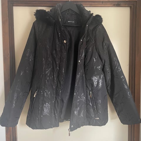 Viininpunainen(kuvioitu punaisella)lämmin naisten talvitakki.Skila merkkinen. Vetoketju hiukan irti alalaidasta,saa muutamalla ompelupistolla korjattua,mutta voi käytyää ilman korjaamistakin, kaksisuuntainen vetoketju. Kai-kai mitta 67cm ja olka-helma 96cm.