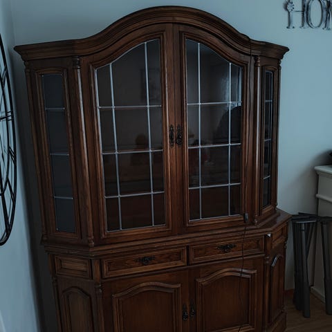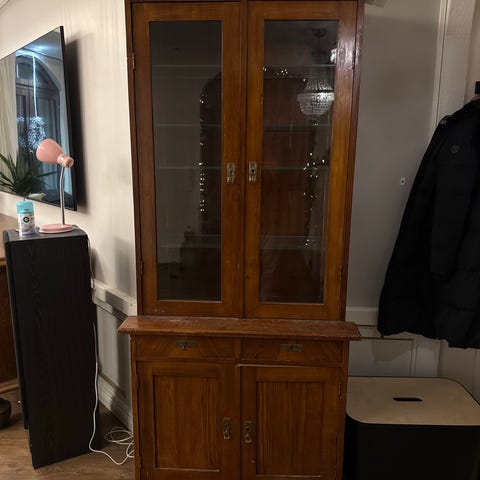 Vanha vitriinikaappi, jossa on puurunko ja kaksi lasiovea. Kaapissa on useita lasihyllyjä esineiden, kirjojen tai astioiden säilytykseen ja esillepanoon. Lasihyllyt on teetetty jälkikäteen mittatilaustyönä. Yläosassa ja sivuilla on koristereunukset. Tuotu 80 -luvulla suomeen ranskansta. Tarkkaa alkuperää tai valmistusvuotta ei tiedetä.