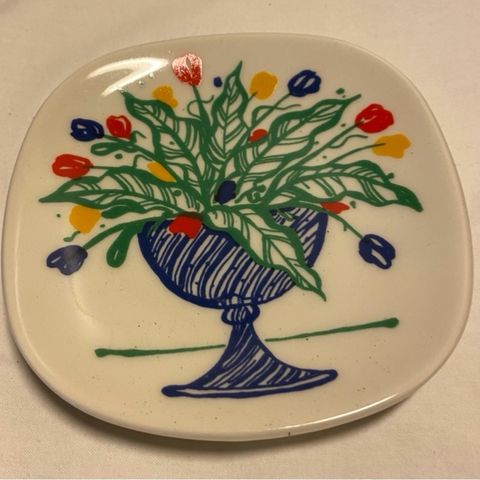 Ulla Huttusen ja Arto Salmisen yhteistyössä syntynyt emali/ koivu- tarjoilulautanen, jossa on signeeraukset. Lautanen sopii tarjoilukäyttöön. Halkaisija 24 cm.