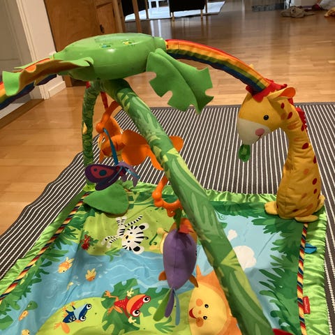 Fisher-Price leikkimatto, jossa on erilaisia värikkäitä kuvioita ja leluja. Sopii lapsille leikkimiseen ja motoristen taitojen kehittämiseen.