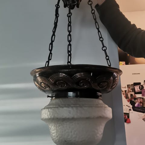 Hakusanat: sisustus, koristeellinen, jugend, art nouveau, ketjuvalaisin, metalliosat, valkoinen lasikupu, antiikki, valaisin, kattovalaisin