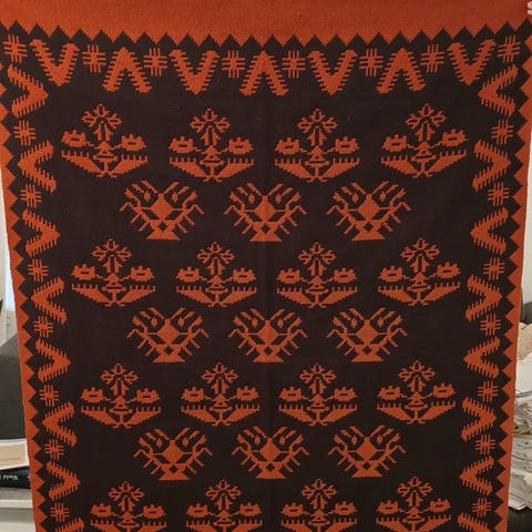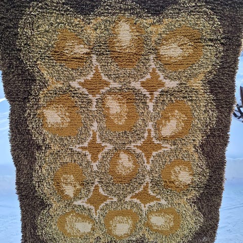 Eteläpohjanmaalla tehty rekiryijy. Malli on todennälöisesti omasta päästä suunniteltu. Elikkä ainut.itse aijoin tehdä siitä ison tyynyn. Insiraatio loppui.yhdestä kohdasta muutama lanka pois. Mutta on huomaamaton