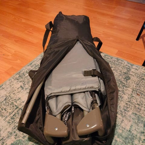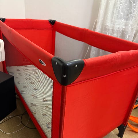 Vain muutaman kerran käytetty ja uutena kaupasta ostettu matkasänky. Pohjan saa kahteen kohtaan alas tai noin puoliväliin.