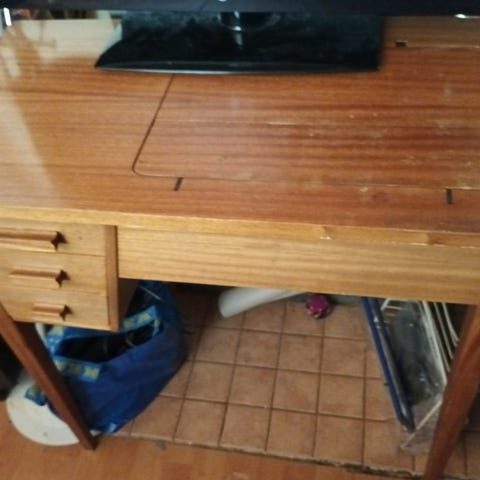 Aikaa nähnyt Muuramen kirjoituspöytä: pöytälevy ja kaksi lipastoa. Keltaisen lipaston yksi kisko hieman rikki. Samoin keltaisen lipaston yksi kansi tulisi liimata kiinni. Sininen lipasto kunnoltaan parempi. Pöytälevyssä myös naarmuja. Säilytetty lämpimässä varastossa, kun ei ole ollut käytössä.Tarjoa! Tämä joutaa nyt varastosta!