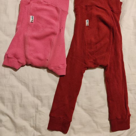 Kahdet villavaippahousut, joista ruskeissa pieniä reikiä ulkokuoressa ja isommat reiät sisälahkeessa. En ole yrittänyt korjata, koska toimineet hyvin noinkin. Pinkeissä värjäytymää ja pieni reikä. Näistä kuvat.