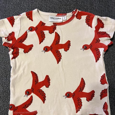 Myydään hyväkuntoinen Mini Rodini t-paita koossa 92/98. Kerman värinen sinisillä linnuilla.