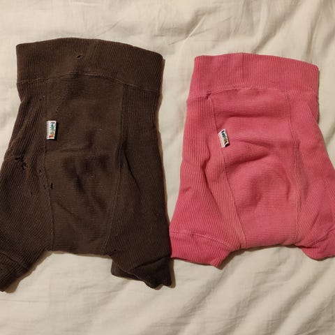 Babyidean villavaippahousut koossa XL, joista toiset pitkäpunttiset ja toiset lyhyet. Pieniä reikiä, jotka näkyvät kuvissa. Pitkät ovat väriltään enemmän viininpunaiset kuin kuvissa. Viininpunaiset pehmoiset, pinkit hieman huopuneet. Hyvin toimineet villakuorina kestovaippailussa.